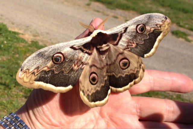 This is Europe’s largest moth, known as the Emperor Moth (Saturnia pavonia). This is a male. The caterpillars are hairy and have orange dots or bands on them.