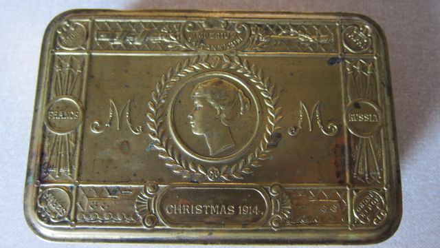 Thousands of brass tins like this one were filled with gifts and sent to First World War soldiers serving in France or Belgium for Christmas Day in 1914. The tins were issued by Mary, Princess Royal and Countess of Harewood.
